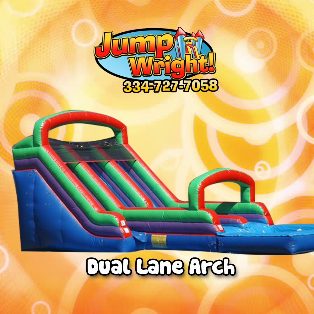 Make your next event unforgettable with our Dual Lane Arch II Water Slide! This vibrant colored, commercial-grade inflatable is perfect for birthdays, family gatherings, church events, and summer parties. Riders climb to the top and slide down into a refreshing splash pool—fun that keeps everyone cool and enjoying the event. This slide is perfect for all ages and is guaranteed to keep your guests entertained for hours.